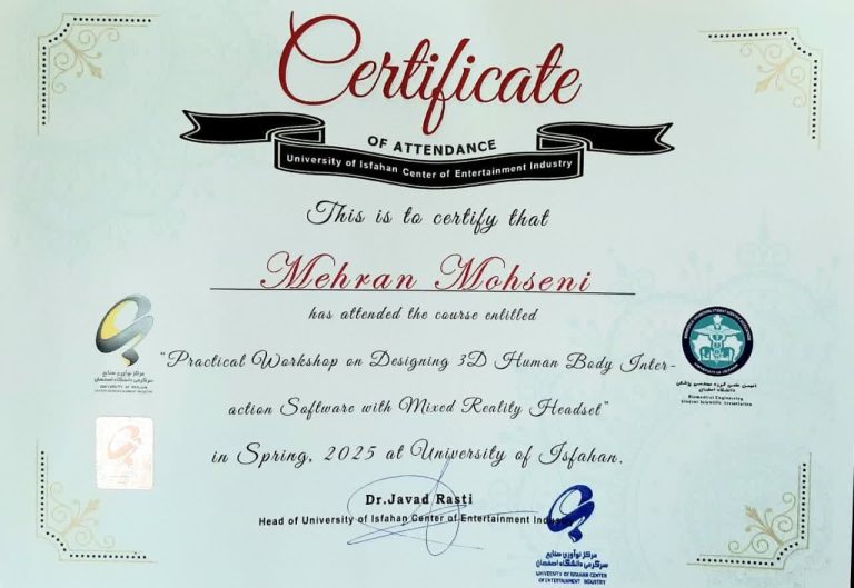 Participated in a hands-on workshop on designing interactive 3D human body software using Meta Quest headset, developed in Unity and Blender, with a focus on Virtual Reality (VR) and Extended Reality (XR) – University of Isfahan, Spring 2025
